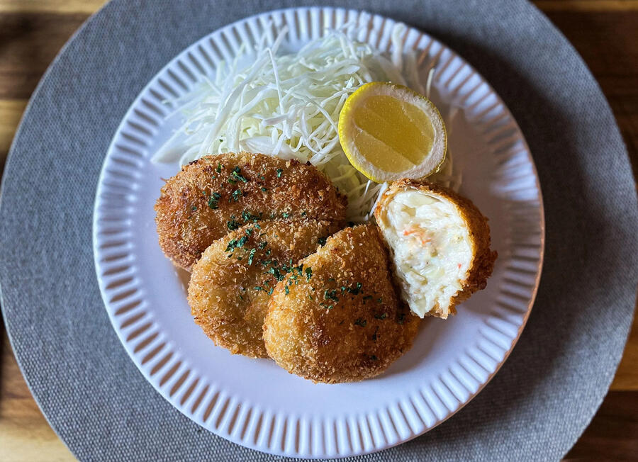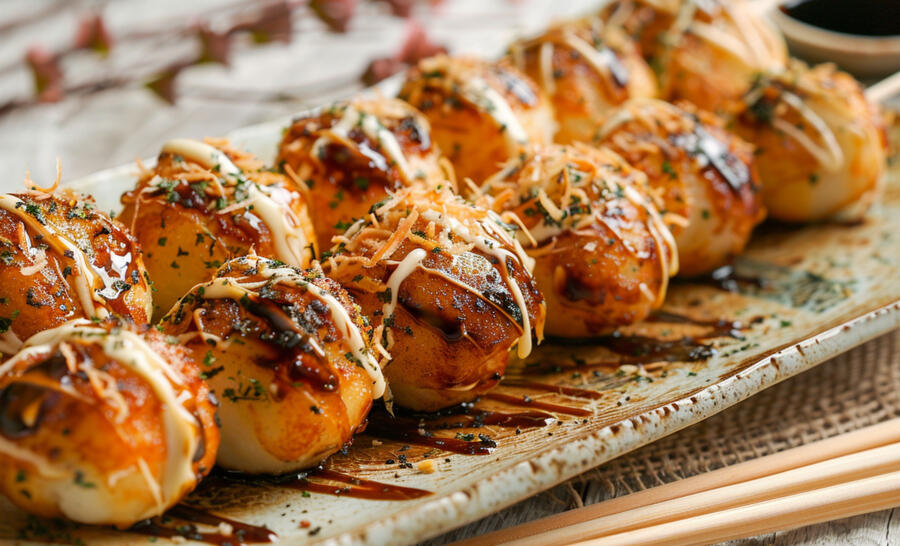 Takoyaki octopus in fried dough, smothered in savory sauce, mayo, sliced green onion and bonito flakes